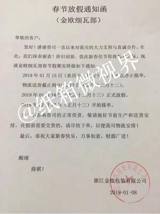 深圳市啟裕昌包裝有限公司:春節放假時間為2019年1月25日-2月14日。 浙江金歐包裝有限公司細瓦部: 2019年01月15日(農歷十二月初十)下午5點停止接單。 物流送貨截止到01月17日(農歷十二月十二)。 2019年01月18日(農歷十二月十三)正式放假。 2019年02月17日(正月十三)開始接單。