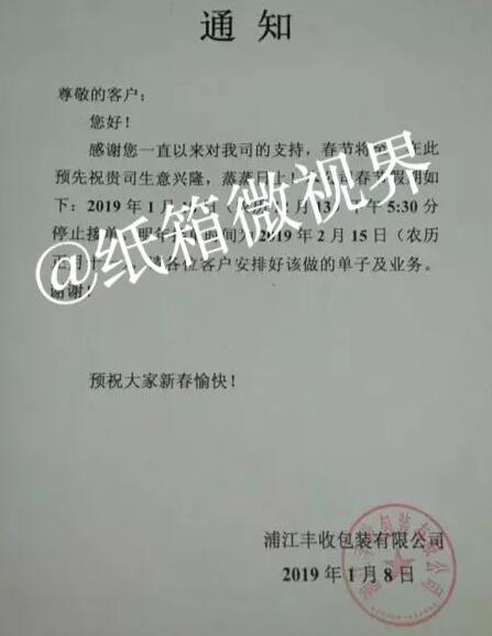 浦江豐收包裝有限公司: 2019年1月18日(農歷12月13)下午5:30分停止接單。 明年接單時間為2019年2月15日(農歷正月十一)。
