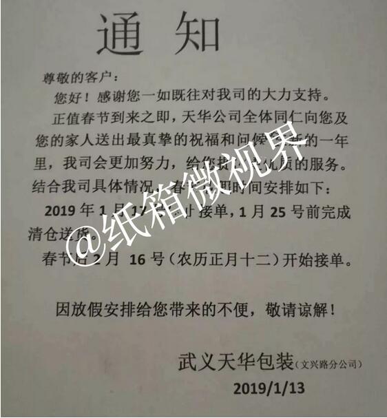 武義天華包裝(文興路分公司): 2019年1月17日停止接單,1月25日前完成清倉送貨,春節后2月16日(農歷正月十二)開始接單。