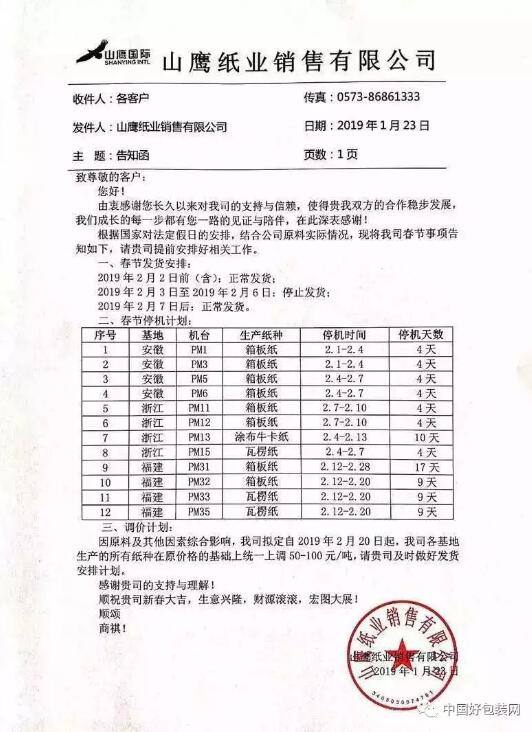 近日,山鷹紙業(yè)發(fā)布了2019年春節(jié)發(fā)貨安排的公函:根據(jù)國家法定節(jié)假日安排及公司原料實(shí)際情況,2月3日-2月6日停止發(fā)貨,2月7日正常發(fā)貨。
