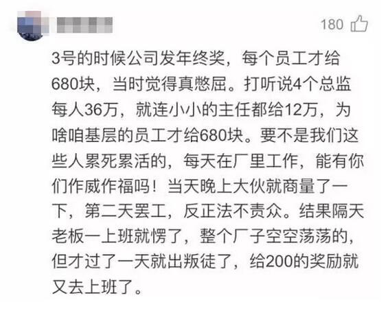 近日在論壇上,看到一個網友留言說,“3號的時候公司發年終獎,每個員工才給680塊,當時覺得真憋屈。打聽說4個總監每人36萬,就連小小的主任都給12萬,為啥咱基層的員工才給680塊。 要不是我們這些人累死累活的,每天在廠里工作,能有你們作威作福嗎! 當天晚上大伙就商量了一下,第二天罷工,反正法不責眾。結果隔天老板一上班就愣了,整個工廠空空蕩蕩的。 但才過了一天就出叛徒了,給200的獎勵就又去上班了。” 1、年終獎發放本來就是論功行賞