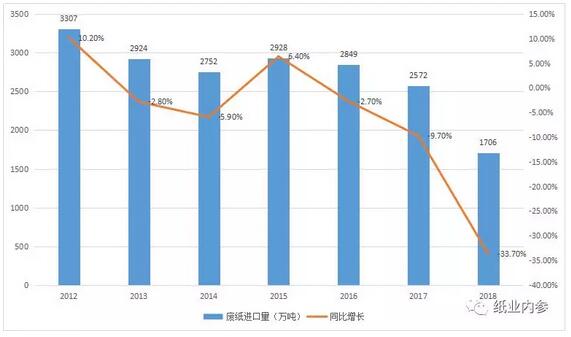 據(jù)resourcerecycling從中國海關總署得到的數(shù)據(jù),2018年,中國共進口各類廢紙1705.5萬噸,低于2017年的2572萬噸,同比減少約33.8%,降幅創(chuàng)近年來之最,與2012年相比,國內進口廢紙量已經(jīng)下跌近一半。