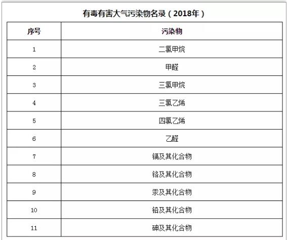 2019年1月23日,生態環境部與衛生健康為聯合制定發布了《有毒有害大氣污染物名錄(2018年)》,污染物包括二氯甲烷、甲醛、三氯甲烷、三氯乙烯等。