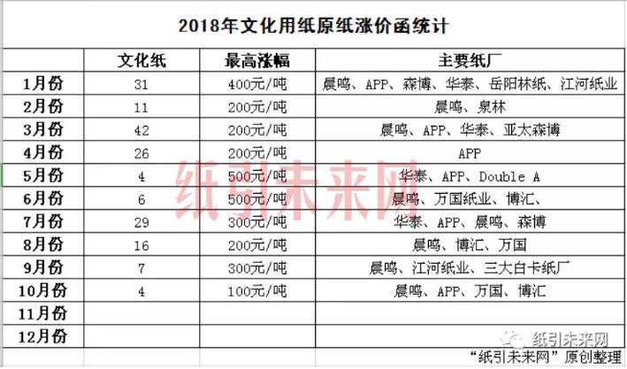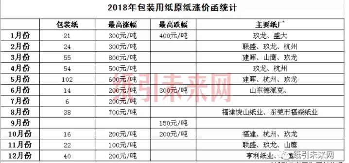 自2017年下半年開始,中國造紙市場發生了一系列的變革,變革帶來的新環境也在繼續影響著2018年的紙品市場。“固廢限制進口”、“遠高于國際的廢紙夾雜物含量0.5%的標準”、“日趨嚴格的環保監察”、“中美貿易戰”等各方因素在中國紙品市場繼續發酵。結果呈現在我們面前就是“無規律可尋的國廢價格”、“旺季出貨低迷的包裝紙市場”、“傳統旺季頻繁停機減產的造紙企業”、“居高不下的木漿價格”、“多次提價未果的木漿下游市場”、以及“快速進行海外收購以及產能轉移的國內規模企業”等等。這些因素,可謂揭示了2018年紙業市場的真實情況:原料缺乏、價格動蕩,業內人士無所適從。在這樣的大背景下,跟著紙引未來網小編來回顧變并展望2019年接下來的走勢吧! 市場表現一:2018紙廠漲價函減少,停機、降價較為頻繁,2019年節后或是關鍵窗口 漲價函:據紙引未來網不完全統計,2018年紙廠發布文化紙原紙漲價函176張,包裝紙原紙漲價函392張,總共累計568張,相較2017年的漲價函1636份,少了將近3倍。 2018年1月市場交投清淡,出貨較為緩慢,紙廠、經銷商為回籠資金降低庫存,玖龍、盛大等紙廠開始試探性降價50元—400元/噸不等。在結束了第一季度原紙漲跌互現的情況后,4月下旬瓦楞原紙價格開始出現連續上漲勢頭,至5月中下旬,價格形成全年最高點,參考均價為4837.5元/噸。由下圖可以看出3、4、5月份迎來全年的漲價函漲價高峰期。受貿易戰和訂單需求影響,2018年下半年開始原紙價格持續走低,直至11月末瓦楞原紙價格達到全年最低點,參考均價為3350元/噸。2018年8、9月共計發布漲價函61張,相較2017年8、9月447張、576張漲價函,可以看出多因素疊加對市場的沖擊有多大,導致旺季不旺,市場訂單的冷淡。