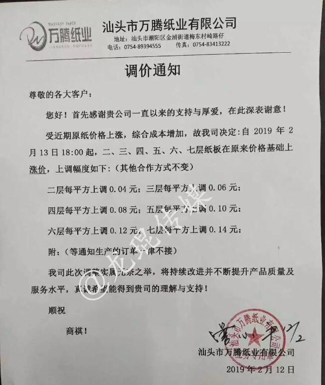 受價格壓力等原因,下游的紙板廠也啟動了漲價模式。2月12日,汕頭市萬騰紙業發布漲價函稱,因近期原紙價格上漲,綜合成本增加,自2月13日18點起,紙板價格在原來的價格基礎上漲價。 其中,二層每平方上調0.04元,三層每平方上調0.06元,四層每平方上調0.08元,五層每平方上調0.10元,六層每平方上調0.12元,七層每平方上調0.14元,待通知生產的訂單一律不接。