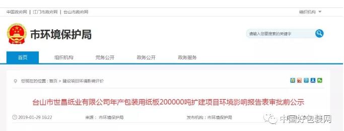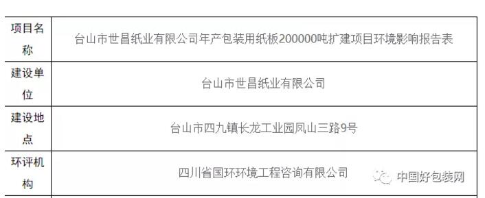 近日,廣東省臺(tái)山市環(huán)境保護(hù)局網(wǎng)發(fā)布公告,臺(tái)山市世昌紙業(yè)有限公司年產(chǎn)包裝用紙板20萬噸擴(kuò)建項(xiàng)目進(jìn)入環(huán)評審批。