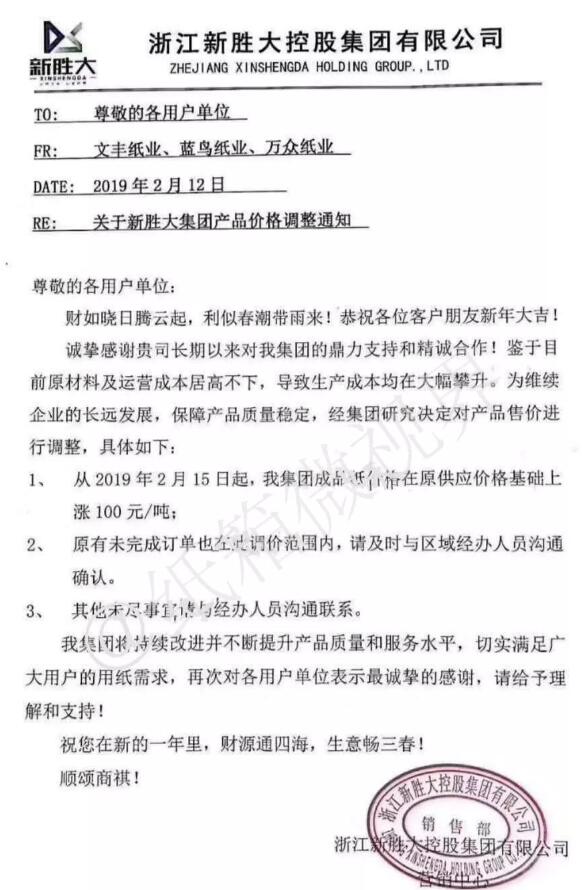2月12日,浙江新勝達控股集團有限公司發布漲價函: 自2019年2月15日起,成品紙價格在原供應價格基礎上上調100元/噸。 原有訂單也在此調價范圍內。