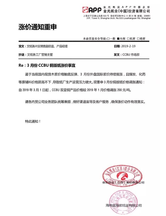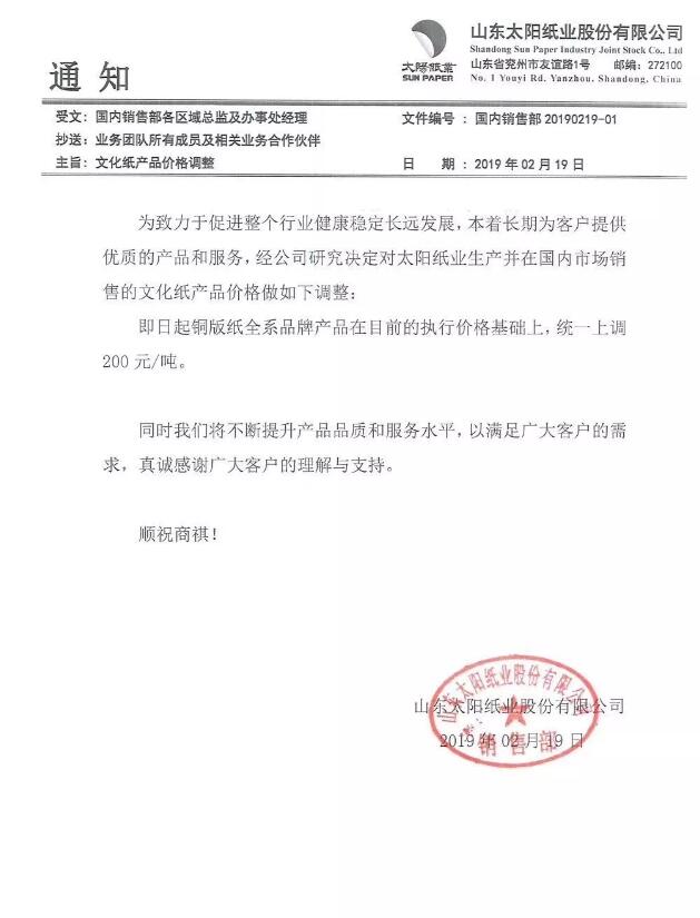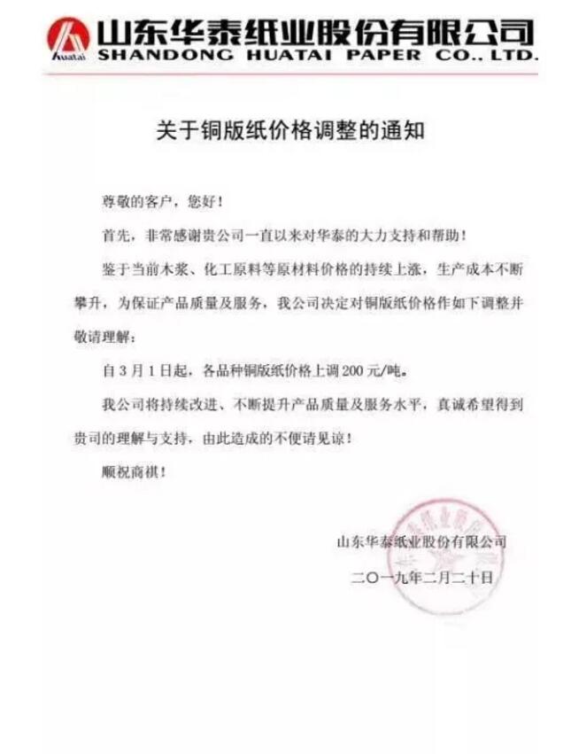 受高位外盤價格支撐,加之上期所針葉漿期貨價格連日上漲,現貨市場貿易商報價堅挺,期現貨價差不斷收窄。但下游主要紙種近期提漲阻力較大,紙廠對高位漿價持觀望態度,多以按需采購為主,內外盤市場高位成交均較為僵持。 現貨價格方面,針葉漿銀星5,700-5,750元/噸,凱利普5,800-5,850元/噸,雄獅5,750元/噸,金獅5,900元/噸,馬牌5,750元/噸,北木6,200元/噸,阿拉巴馬5,650元/噸,烏針5,650元/噸,闊葉漿明星5,700元/噸,鸚鵡5,700元/噸,小鳥5,650-5,700元/噸,本色漿金星5,900元/噸,化機漿昆河4,600元/噸。 期貨方面,2月22日上期所紙漿期貨1906主力合約收盤價5,670元/噸,結算參考價5,626元/噸,較前結算價上漲64元/噸,成交560,956手,持倉194,514手。 受木漿價格反彈等成本壓力驅動,銅版紙價格開始松動,紙廠通過發布漲價函嘗試上漲。APP、太陽紙業、華泰紙業發布漲價函,最遲于3月1日起,銅版紙產品將上漲200元/噸、