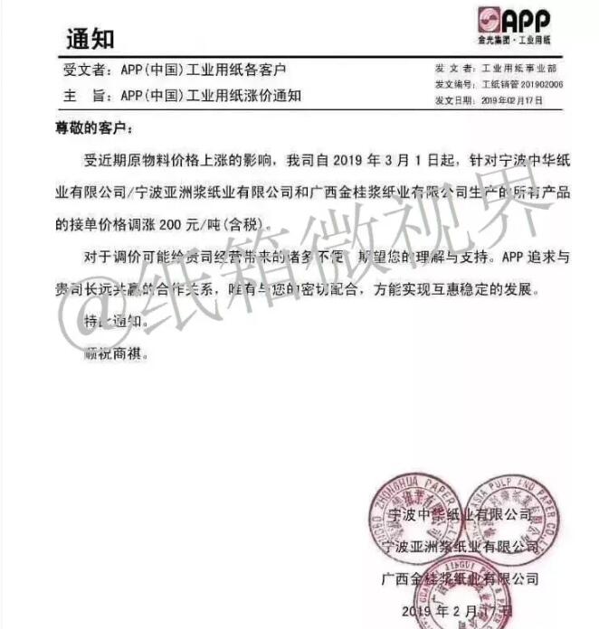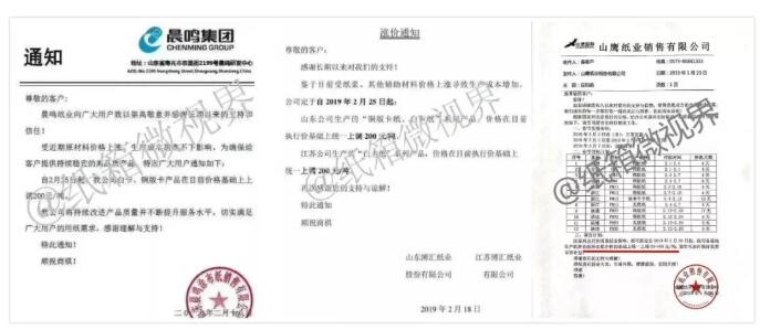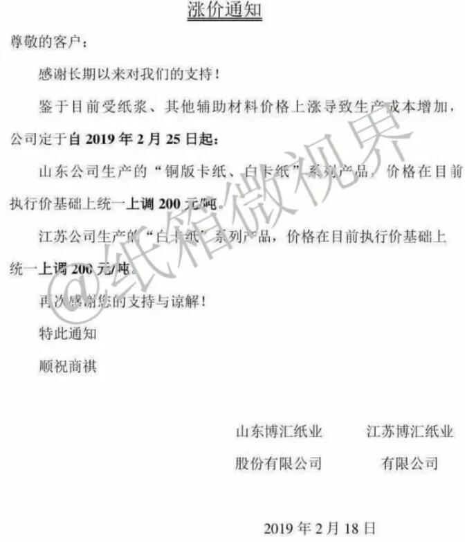 博匯紙業在2月18日發布的漲價函顯示,2019年2月25日起:山東公司生產的“銅版卡紙、白卡紙”系列產品,價格在目前執行價基礎上統一上調200元噸。江蘇公司生產的“白卡紙”系列產品,價格在目前執行價基礎上統一上調200元/噸。