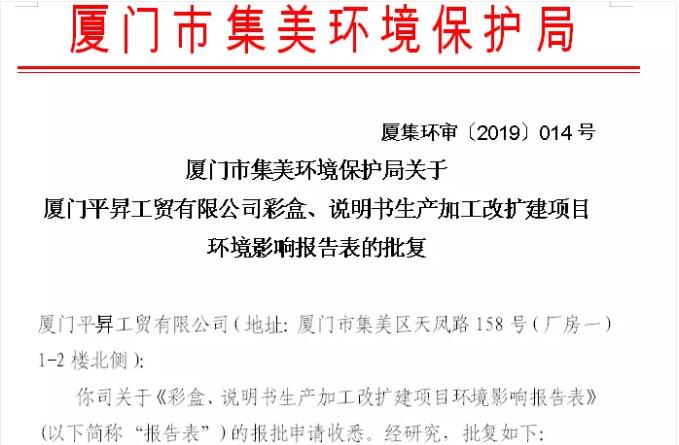 福建省廈門市集美環(huán)境保護局于2月21日發(fā)布了一系列項目的環(huán)評公告,其中廈門平昇工貿有限公司年產12噸彩盒擴建項目通過了環(huán)評,該項目總投資150萬元,其中環(huán)保投資50萬元。