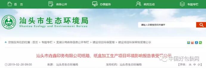 近日,廣東省汕頭市生態(tài)環(huán)境局受理公示了《汕頭市垚鑫印務(wù)有限公司紙箱、紙盒加工生產(chǎn)項目環(huán)境影響報告表》。該項目預(yù)計年產(chǎn)紙箱20萬個、紙盒200萬個,合計約550噸。