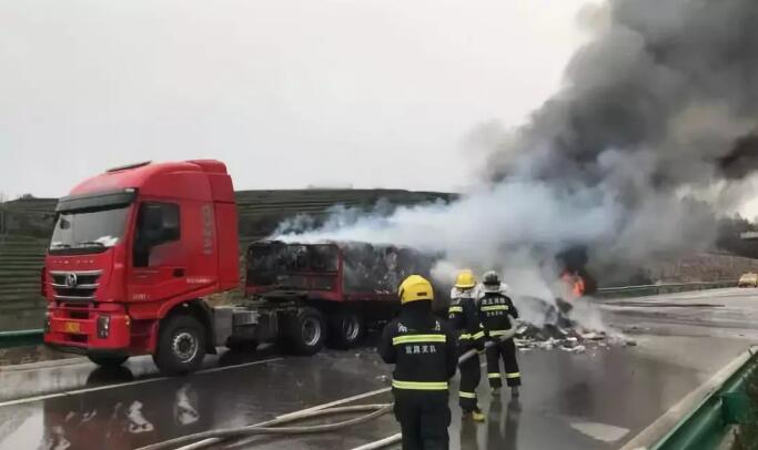 一、一滿載30噸廢紙半掛車起火,疑似輪胎過熱引發。