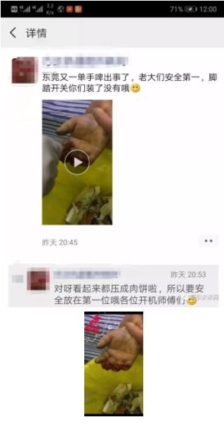 自深圳石巖啤機(jī)師傅發(fā)生安全事故后,近日,又一段小視頻在各大啤機(jī)群轉(zhuǎn)發(fā)!事發(fā)地點(diǎn)正在調(diào)查中..... 視頻內(nèi)容不忍直視就不上傳了,網(wǎng)友直呼“太恐怖啦!”