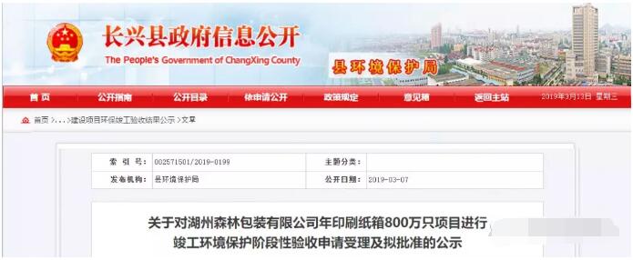 3月5日,浙江省湖州市長興縣環保局發布公告稱,將受理及擬批準湖州森林包裝有限公司年印刷紙箱800萬只項目的竣工環境保護階段性驗收申請。