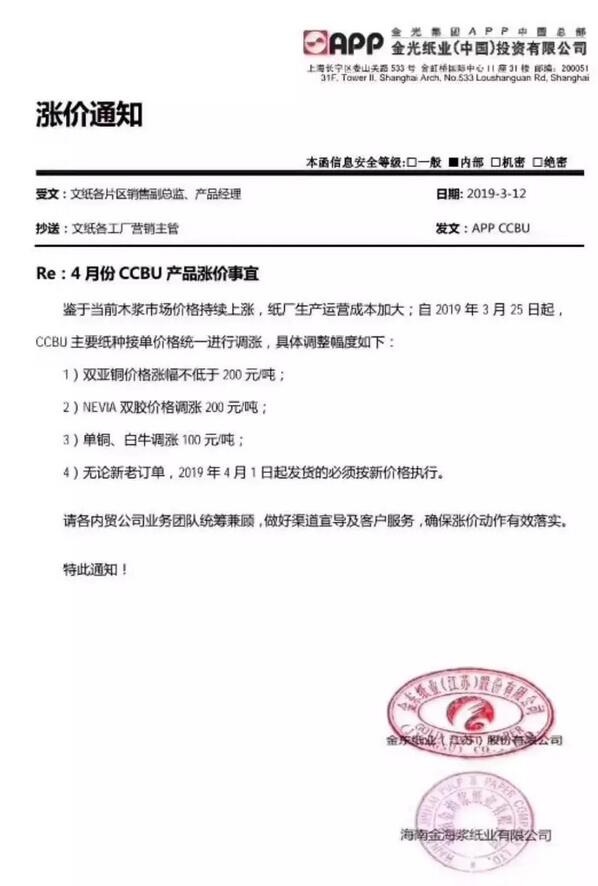 銅版紙 APP:鑒于當前市場木漿價格持續上漲,紙廠生產運營成本加大;自2019年3月25日起,CCBU主要紙種接單價統一進行調漲,具體調整幅度如下: 1)雙亞銅價格漲幅不低于200元/噸; 2)NEVIA雙膠調漲200元/噸; 3)單銅、白牛調漲100元/噸; 4)無論新老訂單,2019年4月1日起發貨的必須按新的價格執行。