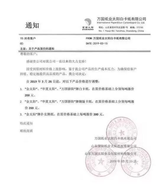 萬國太陽紙業:自3月26日起,對以下產品價格進行調整: 1、“金太陽”、“華夏太陽”、“萬國驕陽”牌白卡紙,在原價格基礎上分別每噸漲價200元。 2、、“金太陽”、“華夏太陽”、“萬國驕陽”牌銅版卡紙,在原價格基礎上分別每噸漲價200元。 3、“金太陽”牌撲克牌紙,在原價格基礎上分別每噸漲價200元。