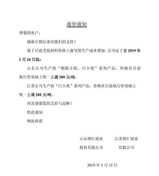 博匯紙業:自3月26日起,山東公司生產的“銅版卡紙、白卡紙”系列產品,價格在目前執行價基礎上統一上調200元/噸。江蘇公司生產的“白卡紙”系列產品,價格在目前執行價基礎上統一上調200元/噸。