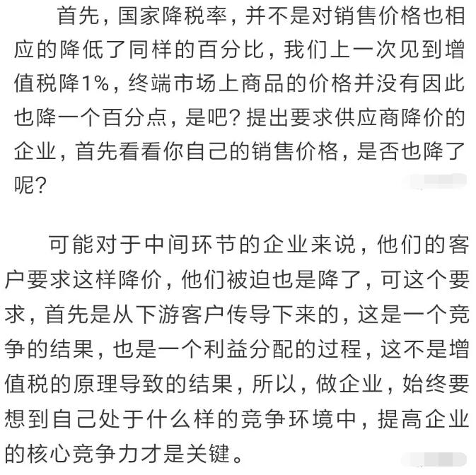 導語:這兩天估計很多朋友都被這段文字刷屏了:增值稅稅率,4月1日起將由16%改成13%。請:之前與我司有合同16%稅率發票的客戶,將款項轉入我公司賬戶,以便我司近期將16%發票開給您。合同簽約未付款或只付了預付款的,四月一日起發票稅率自動改成13%,我司不承擔差價! 如果你的客戶要求你的產品降價怎么辦?是降還是不降? 1、增值稅從16%降至13%,包裝廠利潤將直線上升40% 這樣的減稅,對于企業的發展無疑是重大的利好消息! 有人測算過,增值稅減3%,企業利潤可以提升44.8%。 啥,降低3%的增值稅能提升44%的企業利潤,你在開玩笑吧,這怎么可能? 例如一家工廠A,采購了價值300萬元的原材料,收到了300萬元的增值稅發票,這個發票是原材料廠商提供給他的。 然后,這家工廠生產的產品,以1000萬元售出,那么他需要以1000萬為基數繳納增值稅,抵扣掉300萬的進項,實際需要為700萬元繳納增值稅,以16%計算,需要繳納112萬元。 那么這700萬是不是工廠的利潤呢?當然不是,扣除銀行貸款、工人工資、設備折舊等,一年能賺50萬就不錯了。中國制造業的平均利潤占營收的比例,為3.3%。 如果增值稅率從16%降低到13%,就能給工廠A帶來額外21萬的利潤,企業利潤可不是直線上升40%么? 2、稅率下調3%后,客戶借機要求降價3%,怎么辦? 這一減稅政策出臺后本是對制造企業的一項重大利好,但有不少老板反映,他們的客戶借機提出了降價要求。基于政府提出增值稅從16%降至13%,降了3個百分點,所以價格方面是否也能降低3個點。 從感覺上來說,似乎給客戶降價3%是合理的,但從直覺上又覺得簡單降價3%不太對。感覺不對,有點亂,得捋一捋。那小編來給大家算一下這筆賬,現在假設你的采購成本是100元,成交價是120元: 如果按照原本16%增值稅率: 進項稅是100*0.16=16元, 出項繳稅是120*0.16=19.2元, 納稅額為:19.2-16=3.2元。 實際利潤為120-100-3.2=16.8元。 按照新的增值稅為13%: 進項稅是100*0.13=13元, 出項稅是120*0.13=15.6元, 納稅額為:15.6-13=2.6元, 實際利潤為120-100-2.6=17.4元。 這意味著降低增值稅,讓老板們少繳納了17.4-16.8=0.6元增值稅。 但如果你給客戶降價3%,成本價還是100元,而成交價是120*(1-3%)=116.4元。 按新的13%增值稅率, 進項稅是100*0.13=13元, 出項繳稅是116.4*0.13=15.132元, 實際進項抵扣后, 納稅額為:15.132-13=2.132元。 實際利潤為116.4-100-2.132=14.268元。 這比原來未降價未減稅 少賺了16.8-14.268=2.532元, 利潤減少了15.1%! 這不算不知道,算了嚇一跳。 不是說好降3%的嗎? 怎么利潤一下降了15%? 其實在你給客戶降價的情況下, 如果你的供應商沒有給你同時降價, 那么你的利潤將損失將近15%。 所以, 買賣有風險,降價需謹慎。