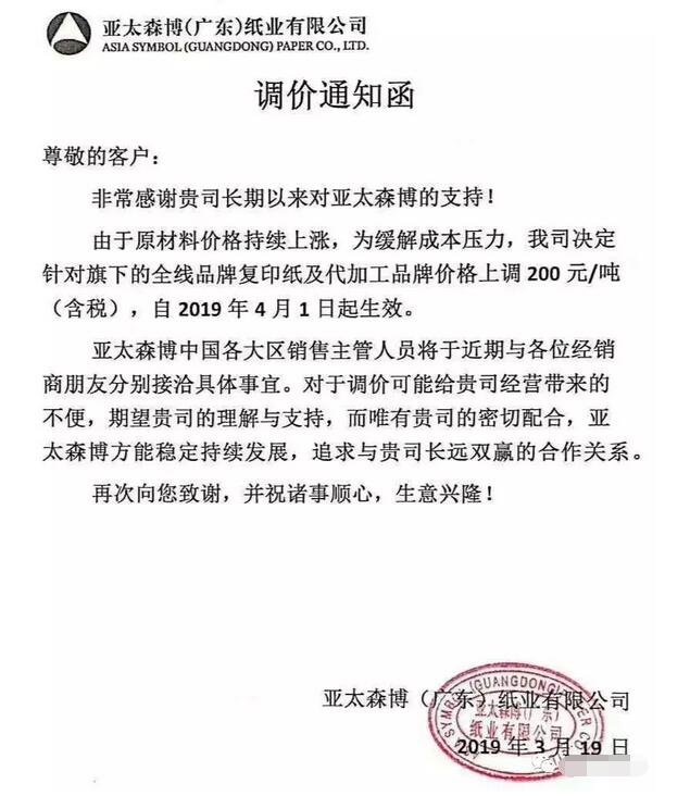 亞太森博(廣東)紙業有限公司:由于原材料價格持續上漲,為緩解成本壓力,我司決定針對旗下的全線品牌復印紙及代加工品牌價格上調200元/噸(含稅),自2019年4月1日起生效。