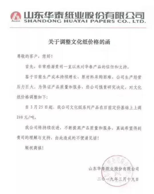 山東泉林集團有限公司:鑒于目前原材物料、能源等各種造紙原輔材料價格不斷上漲,為緩解企業生產運營成本壓力,持續為您提供優質的產品和服務,經公司研究決定,自2019年3月20日起,我公司精制膠版印刷紙上調300元/噸,其它所有品牌文化用紙價格統一上調200元/噸。