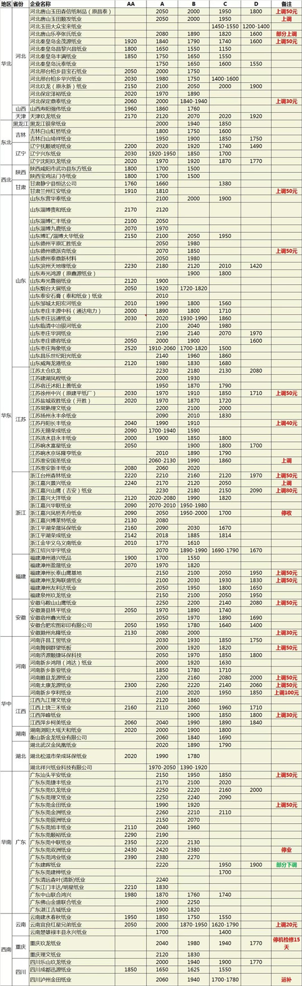 持續下跌一個多月后,包裝紙市場終于觸底反彈。回顧3月的幾輪跌價一直延續到4月的第一周,但從昨天開始幾張漲價停機檢修的函迅速刷爆紙包裝朋友圈。重慶玖龍、江門市明星紙業宣布停機15-60天不等,華發紙業(福建)、安徽浙源再生紙業等紙廠宣布紙價上漲50-100元/噸。是否是觸底反彈的信息尚不明確,但造紙廠有意拉漲紙價動機很明顯。 一、山鷹三大基地齊漲價,全國多家紙廠上調廢紙價格 4月09日最高上調100元/噸,廢紙指數1945.14,環比上調0.73%。華東地區上調20-50元/噸。華南地區上調30-50元/噸。華中地區上調50-100元/噸。北部地區上調30-50元/噸。西部地區上調20-50元/噸。 山東: 山東濰坊匯勝紙業,廢紙價格上調50元/噸。 山東德州德派克紙業,廢紙價格上調50元/噸。 浙江: 浙江嘉興山鷹(吉安)紙業,黃板ABCDE上調30元/噸。 浙江嘉興景興紙業,廢紙價格上調50元/噸,甲牛、辦公廢紙不變。 浙江嘉興鳳橋秀舟紙業,因場地改造,紙板停止收貨,紙管正常收購。 安徽: 安徽馬鞍山山鷹紙業,國廢黃板上調50元/噸。 安徽兆隆紙業,廢紙價格上調30元/噸。 福建: 福建漳州山鷹紙業,黃板價格上調50元/噸。 福建漳州聯盛紙業,黃板類上調50元/噸。 福建漳州華發紙業,廢紙價格上調30元/噸。 江蘇: 江蘇徐州中興(建平)紙業,廢紙價格上調50元/噸。 江蘇丹陽長豐紙業,廢紙價格上調20-40元/噸。 廣東: 廣東東莞金田紙業,紙皮、坑卡上調50元/噸。 廣東東莞中聯紙業,廢紙價格上調50元/噸。 廣東東莞建暉紙業,廢紙價格調整。 廣東中山永發紙業,廢紙價格上調30元/噸。 廣東中山聯合鴻興紙業,廢紙價格上調30元/噸。 廣東汕頭平安紙業,廢紙價格上調50元/噸。 廣東東莞駿業紙業,廢紙價格上調30元/噸。 河南: 河南新鄉亨利紙業,廢紙價格上調100元/噸。 河南太康龍源紙業,廢紙價格上調50元/噸。 河南舞鋼群望紙板,廢紙價格上調50元/噸。 河北: 河北秦皇島金茂源紙業,廢紙價格上調50元/噸。 河北唐山樂亭張氏紙業,A級、D級上調30元/噸,其他不變。 河北唐山玉田森信紙制品(原昌泰紙業),廢紙價格上調50元/噸。 河北唐山玉田順發紙業,廢紙價格上調50元/噸。 河北保定鼎泰紙業,廢紙價格上調30元/噸。 云南: 云南宜良紅星兄弟紙業,廢紙價格上調20元/噸。 甘肅: 甘肅蘭州紅安紙業,廢紙價格上調50元/噸。
