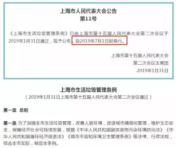 2019年1月下旬,國務(wù)院辦公廳發(fā)布了《“無廢城市”建設(shè)試點工作方案》,部署開展“無廢城市”建設(shè)試點工作,重點推進固廢源頭處理的減量和資源化利用,最大限度地減少填埋量,而“46城”垃圾分類強制試點也將全面開啟,由此將催生出“固廢處理”背后的數(shù)萬億元處置市場前景。 近來,不少城市出臺了垃圾分類明確的剛性約束和制度規(guī)范。 1、上海:強制垃圾分類,7月1日起正式實施 2019年1月31日,上海市十五屆人大二次會議表決通過《上海市生活垃圾管理條例》(以下簡稱《條例》),并將于7月1日正式開始實施。