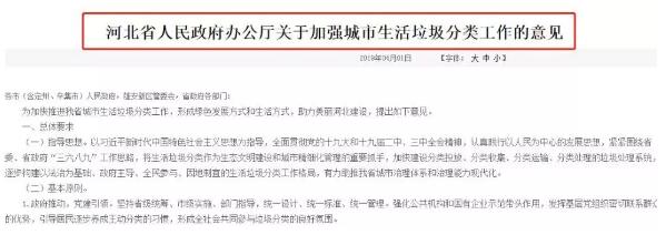 此舉標(biāo)志著,在推行20多年后,“垃圾分類”在申城納入法治框架:個人混合投放垃圾,今后最高可罰200元;單位混裝混運,最高則可罰5萬元。 屆時,上海黨政機關(guān)內(nèi)部辦公場所不得使用一次性杯具,旅館不得主動提供一次性日用品,餐館、外賣不得主動提供一次性餐具。 2、河北:6年建成垃圾分類“無廢城市” 4月1日,河北省人民政府辦公廳出臺《關(guān)于加強城市生活垃圾分類工作的意見》。意見指出,河北省將加快建設(shè)分類投放、分類收集、分類運輸、分類處理的垃圾處理系統(tǒng)。其中,雄安新區(qū)要建立具有國際先進水平的生活垃圾強制分類制度,按照“無廢城市”標(biāo)準(zhǔn)規(guī)范做好規(guī)劃設(shè)計和建設(shè)。