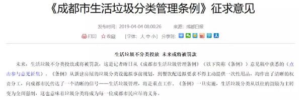 2019年底前 各市全面啟動生活垃圾分類工作,分別建成5個以上生活垃圾分類示范單位和示范社區(qū)。 2020年底前 各市公共機構(gòu)垃圾分類覆蓋率達到50%以上,相關(guān)企業(yè)和居民社區(qū)垃圾分類覆蓋率達到30%以上。石家莊、邯鄲市作為首批國家垃圾分類試點城市,張家口市作為2022年冬奧會協(xié)辦城市,應(yīng)于2020年底前基本建成生活垃圾分類處理系統(tǒng)。 2022年底前 各市公共機構(gòu)垃圾分類覆蓋率達到75%以上,相關(guān)企業(yè)和居民社區(qū)垃圾分類覆蓋率達到50%以上。 2025年底前 生活垃圾回收利用率達到35%以上,基本建成生活垃圾分類處理系統(tǒng)。 3、成都:全面強制垃圾分類,最高罰款10萬 4月2日,成都市政府官網(wǎng)立法征集板塊公開了《成都市生活垃圾管理條例》。 1、可回收物應(yīng)當(dāng)交售給再生資源回收站點、回收經(jīng)營者,或者投放至可回收物收集容器、收集點; 2、有害垃圾應(yīng)當(dāng)交給有害垃圾回收站點,或者投放至有害垃圾收集容器; 3、餐廚垃圾應(yīng)當(dāng)投放至餐廚垃圾收集容器; 4、其他垃圾應(yīng)當(dāng)投放至其他垃圾收集容器。