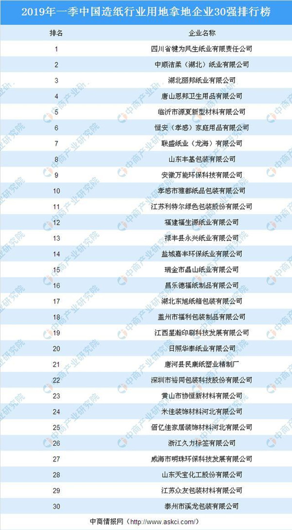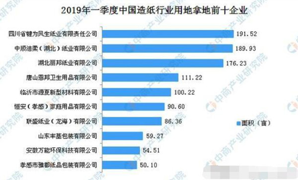 據榜單顯示,進入榜單前十企業分別為:四川省犍為鳳生紙業有限責任公司、中順潔柔(湖北)紙業有限公司、湖北麗邦紙業有限公司、唐山恩邦衛生用品有限公司、臨沂市源夏新型材料有限公司、恒安(孝感)家庭用品有限公司、聯盛紙業(龍海)有限公司、山東豐基包裝有限公司、安徽萬能環保科技有限公司、孝感市雅都紙品包裝有限公司。其中,四川省犍為鳳生紙業有限責任公司2019年一季度用地拿地面積最多,達191.52畝。