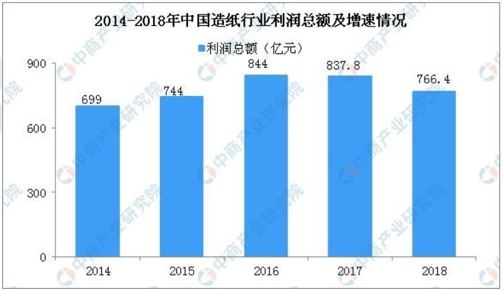 數(shù)據(jù)來(lái)源:中商產(chǎn)業(yè)研究院大數(shù)據(jù)庫(kù) 三、中國(guó)造紙行業(yè)利潤(rùn)總額下滑 受原料供給受限,企業(yè)生產(chǎn)成本長(zhǎng),同時(shí)下游需求不振等因素影響,2018年中國(guó)造紙企業(yè)利潤(rùn)有所下滑。造紙企業(yè)利潤(rùn)總額由2017年837.8億元降至2018年的766.4億元,降幅8.5%%。