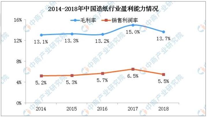 數(shù)據(jù)來(lái)源:中商產(chǎn)業(yè)研究院大數(shù)據(jù)庫(kù) 四、中國(guó)造紙行業(yè)盈利能力下降 近年來(lái),我國(guó)造紙行業(yè)盈利能力呈現(xiàn)提高的趨勢(shì),毛利率超13%,銷售利潤(rùn)率由2013年的5.2%提高至2017年的6.5%。2018年造紙行業(yè)盈利有所下降,毛利率13.7%,銷售利潤(rùn)率5.5%。