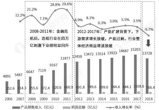 資料來源:前瞻產業研究院整理 中國造紙行業發展現狀分析 ——造紙行業營收首次下跌,但行業景氣度仍較高 金融危機后,造紙行業的經營狀況波動較大。2008-2011年,金融危機后,造紙行業在四萬億刺激下業績明顯回升,主要紙張種類的價格都企穩回升,這一階段規模以上企業產品銷售收入增長速度較快,最高增速達39.6%;2012-2017年,在企業相繼擴大產能的背景下,造紙及紙制品行業的下游需求增長放緩,產能過剩,行業整體經濟效益增速放緩,在5%上下浮動。 據國家統計局統計,2018年,我國規模以上造紙及紙制品企業實現主營業務收入13728億元,同比下降9.7%;利潤總額766.4億元,同比下降25.49%。分析出現這一情況的原因是由于以下原因。 第一,從供給看,造紙行業在經歷2016-2017年行業紅利后,進入了新一輪產能投放周期;此外,2017年來自亞洲周邊國家的原紙進口量大幅增加,全年總進口量增長至65萬噸,其中在國內瓦楞紙價格高點的第四季度進口量就達到31萬噸,受此影響國內紙價回落,影響2018年產品銷售收入。 第二,從需求看,中美貿易戰影響下,造紙行業的下游包裝行業出口預期受影響,包裝采購意愿低;與此同時,國內消費低迷,2018年全年社會消費品零售總額低于10%,包裝訂單也受到影響。 2006-2018年我國規模以上造紙及紙制品企業營業務收入、利潤總額統計及增長情況