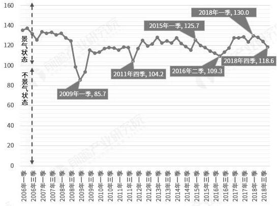 數據來源:前瞻產業研究院整理 中國造紙行業行業景氣指數仍處于較高區間 從國家統計局的行業景氣指數來看,僅2009年我國造紙及紙制品行業景氣指數低于100,處于不景氣狀態;2010年以來我國造紙及紙制品行業景氣指數始終高于100,均處于景氣狀態。但值得注意的是,2018年以來,造紙及紙制品行業景氣指數就逐漸下滑,2018年一季度景氣指數為130,2018四季度末景氣指數為118.6,但行業景氣指數仍處于較高區間。 2006-2018年我國造紙及紙制品行業景氣指數統計情況