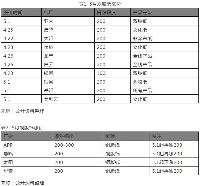 進入2019年,文化紙的表現一直堅挺。從1月開始文化紙就進入新一輪提價周期,進入1~2月紙廠發布兩輪漲價,價格在第一季度基本上都得到較好落實,4月份整體市場仍屬偏暖行情,文化紙繼續推漲,接單也基本順暢,從春節后400~500元/噸的漲幅基本也是確定了一輪反彈基調,5月延續漲價熱潮。如表1、表2。