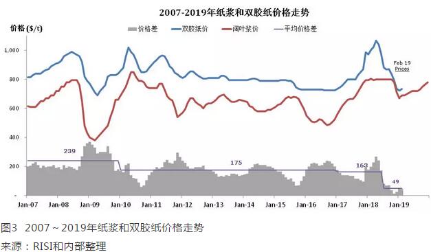 國產木漿供應量減少 4月國產闊葉漿廠計劃于檢修,預計減少闊葉漿排產17萬噸。 — APP計劃4月5日到4月16日停機檢修12天,預計減產6.5萬噸; — 亞太森博因5月份停機水洗及轉產溶解漿減少闊葉漿供應約8萬噸; — 王子計劃5月份停機2周,預計減產2.5萬噸。 漿廠供應的減少進一步給漿價做了支撐。 2019年紙漿會穩中偏緊,紙價與漿價長期保持合理價格差,預計紙價會進一步上漲,修復到合理水平。如圖3。