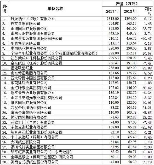 一、紙及紙板生產(chǎn)和消費(fèi)情況 (一)紙及紙板生產(chǎn)量和消費(fèi)量 據(jù)中國造紙協(xié)會調(diào)查資料,2018年全國紙及紙板生產(chǎn)企業(yè)約2700家,全國紙及紙板生產(chǎn)量10435萬噸,較上年增長-6.24%。消費(fèi)量10439萬噸,較上年增長-4.20%,人均年消費(fèi)量為75千克(13.95億人)。2009~2018年,紙及紙板生產(chǎn)量年均增長率2.12%,消費(fèi)量年均增長率2.22%。 (二)紙及紙板主要產(chǎn)品生產(chǎn)和消費(fèi)情況 1、新聞紙 2018年新聞紙生產(chǎn)量190萬噸,較上年增長-19.15%;消費(fèi)量237萬噸,較上年增長-11.24%。2009~2018年生產(chǎn)量年均增長率-9.78%,消費(fèi)量年均增長率-7.13%。 2、未涂布印刷書寫紙 2018年未涂布印刷書寫紙生產(chǎn)量1750萬噸,較上年增長-2.23%;消費(fèi)量1751萬噸,較上年增長0.40%。2009~2018年生產(chǎn)量年均增長率1.65%,消費(fèi)量年均增長率1.76%。 3、涂布印刷紙 2018年涂布印刷紙生產(chǎn)量705萬噸,較上年增長-7.84%;消費(fèi)量604萬噸,較上年增長-4.73%。2009~2018年生產(chǎn)量年均增長率1.98%,消費(fèi)量年均增長率3.00%。 其中:銅版紙 2018年銅版紙生產(chǎn)量655萬噸,較上年增長-2.96%;消費(fèi)量581萬噸,較上年增長-0.68%。2009~2018年生產(chǎn)量年均增長率3.05%,消費(fèi)量年均增長率4.26%。 4、生活用紙 2018年生活用紙生產(chǎn)量970萬噸,較上年增長1.04%;消費(fèi)量901萬噸,較上年增長1.24%。2009~2018年生產(chǎn)量年均增長率5.88%,消費(fèi)量年均增長率6.10%。 5、包裝用紙 2018年包裝用紙生產(chǎn)量690萬噸,較上年增長-0.72%;消費(fèi)量701萬噸,較上年增長-0.85%。2009~2018年生產(chǎn)量年均增長率2.05%,消費(fèi)量年均增長率1.99%。 6、白紙板 2018年白紙板生產(chǎn)量1335萬噸,較上年增長-6.64%;消費(fèi)量1219萬噸,較上年增長-6.16%。2009~2018年生產(chǎn)量年均增長率1.67%,消費(fèi)量年均增長率0.55%。 其中:涂布白紙板 2018年涂布白紙板生產(chǎn)量1275萬噸,較上年增長-6.93%;消費(fèi)量1158萬噸,較上年增長-6.46%。2009~2018年生產(chǎn)量年均增長率1.65%,消費(fèi)量年均增長率0.47%。 7、箱紙板 2018年箱紙板生產(chǎn)量2145萬噸,較上年增長-10.06%;消費(fèi)量2345萬噸,較上年增長-6.57%。2009~2018年生產(chǎn)量年均增長率2.42%,消費(fèi)量年均增長率2.93%。 8、瓦楞原紙 2018年瓦楞原紙生產(chǎn)量2105萬噸,較上年增長-9.85%;消費(fèi)量2213萬噸,較上年增長-7.64%。2009~2018年生產(chǎn)量年均增長率2.30%,消費(fèi)量年均增長率2.59%。 9、特種紙及紙板 2018年特種紙及紙板生產(chǎn)量320萬噸,較上年增長4.92%;消費(fèi)量261萬噸,較上年增長4.82%。2009~2018年生產(chǎn)量年均增長率8.78%,消費(fèi)量年均增長率6.83%。 二、紙及紙板生產(chǎn)企業(yè)經(jīng)濟(jì)指標(biāo)完成情況 據(jù)國家統(tǒng)計局統(tǒng)計,2018年1~12月規(guī)模以上造紙生產(chǎn)企業(yè)2657家;主營業(yè)務(wù)收入8152億元;工業(yè)增加值增速-0.70%;產(chǎn)成品存貨390億元,同比增長14.31%;利潤總額466億元,同比增長-15.05%;資產(chǎn)總計10505億元,同比增長4.58%;資產(chǎn)負(fù)債率59.30%,較上年增加3.39個百分點(diǎn);負(fù)債總額6229億元,同比增長6.02%;在統(tǒng)計的2657家造紙生產(chǎn)企業(yè)中,虧損企業(yè)有543家,占20.44%。 三、紙漿生產(chǎn)和消耗情況 (一)2018年紙漿生產(chǎn)情況 據(jù)中國造紙協(xié)會調(diào)查資料,2018年全國紙漿生產(chǎn)總量7201萬噸,較上年增長-9.41%。其中:木漿1147萬噸,較上年增長9.24%;廢紙漿5444萬噸,較上年增長-13.61%;非木漿610萬噸,較上年增長2.17%。 (二)2018年紙漿消耗情況 2018年全國紙漿消耗總量9387萬噸,較上年增長-6.61%。木漿3303萬噸,占紙漿消耗總量35%,其中進(jìn)口木漿占23%、國產(chǎn)木漿占12%;廢紙漿5474萬噸,占紙漿消耗總量58%,其中用進(jìn)口廢紙制漿占16%、用國產(chǎn)廢紙制漿占42%;非木漿610萬噸,占紙漿消耗總量7%。 (三)2018年廢紙利用情況 2018年全國廢紙回收總量4964萬噸,較上年增長-6.07%,廢紙回收率48%,廢紙利用率64%,2009~2018年廢紙回收總量年均增長率3.39%。 四、紙制品生產(chǎn)和消費(fèi)情況 根據(jù)國家統(tǒng)計局?jǐn)?shù)據(jù),2018年全國規(guī)模以上紙制品生產(chǎn)企業(yè)4003家,生產(chǎn)量5578萬噸,較上年增長-17.98%;消費(fèi)量5273萬噸,較上年增長-19.04%;進(jìn)口量18萬噸,出口量323萬噸。2009~2018年,紙制品生產(chǎn)量年均增長率3.99%,消費(fèi)量年均增長率3.88%。 五、紙及紙板、紙漿、廢紙及紙制品進(jìn)出口情況 (一)紙及紙板、紙漿、廢紙及紙制品進(jìn)口情況 2018年紙及紙板進(jìn)口622萬噸,較上年增長33.48%;紙漿進(jìn)口2479萬噸,較上年增長4.51%;廢紙進(jìn)口1703萬噸,較上年增長-33.79%;紙制品進(jìn)口18萬噸,較上年增長-5.26%。 2018年進(jìn)口紙及紙板、紙漿、廢紙、紙制品合計4822萬噸,較上年增長-11.18%,用匯302.12億美元,較上年增長15.67%。進(jìn)口紙及紙板平均價格為888.99美元/噸,較上年平均價格增長-1.36%;進(jìn)口紙漿平均價格為795.31美元/噸,較上年平均價格增長22.99%;進(jìn)口廢紙平均價格為252.03美元/噸,較上年平均價格增長10.33%。 (二)紙及紙板、紙漿、廢紙及紙制品出口情況 2018年紙及紙板出口618萬噸,較上年增長-11.59%;紙漿出口9.99萬噸,較上年增長1.22%;廢紙出口0.06萬噸,較上年增長-60.00%;紙制品出口323萬噸,較上年增長5.21%。 2018年出