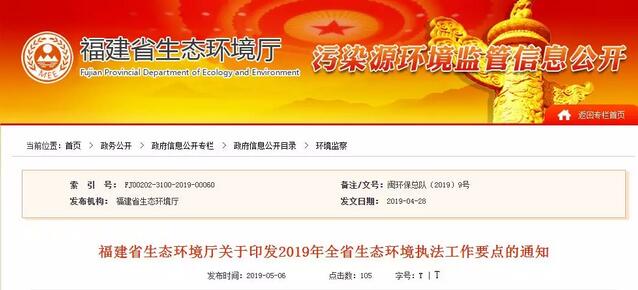 福建省生態(tài)環(huán)境廳關(guān)于印發(fā)2019年全省生態(tài)環(huán)境執(zhí)法工作要點(diǎn)的通知 各設(shè)區(qū)市生態(tài)環(huán)境局,平潭綜合實(shí)驗(yàn)區(qū)環(huán)境與國(guó)土資源局: 為切實(shí)做好2019年我省生態(tài)環(huán)境執(zhí)法工作,根據(jù)《2019年全國(guó)生態(tài)環(huán)境執(zhí)法工作要點(diǎn)》,結(jié)合我省實(shí)際,我廳制定了《2019年全省生態(tài)環(huán)境執(zhí)法工作要點(diǎn)》,現(xiàn)印發(fā)給你們,請(qǐng)結(jié)合實(shí)際認(rèn)真抓好貫徹落實(shí)。 福建省生態(tài)環(huán)境廳 2019年4月28日
