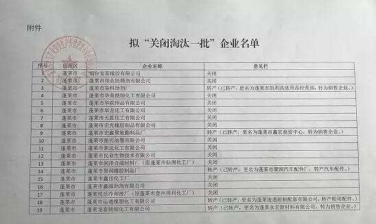 蓬萊擬“關(guān)閉淘汰一批”(第一批)化工生產(chǎn)企業(yè)名單