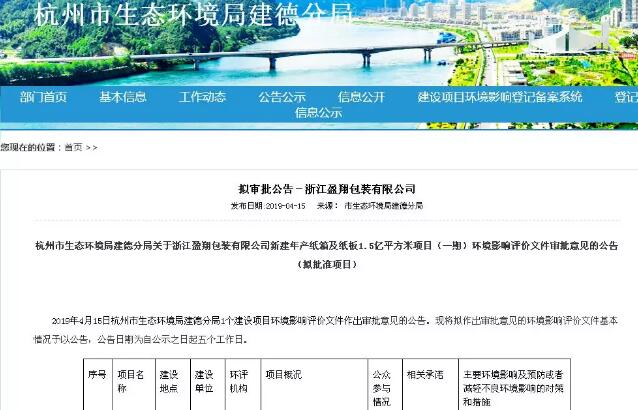 導語:近期,浙江省杭州市生態(tài)環(huán)境局建德分局發(fā)布環(huán)評審批意見公告,擬批準浙江盈翔包裝年產1.5億紙板紙箱項目實施。