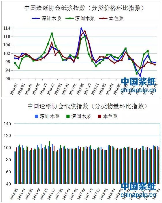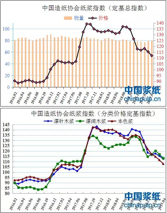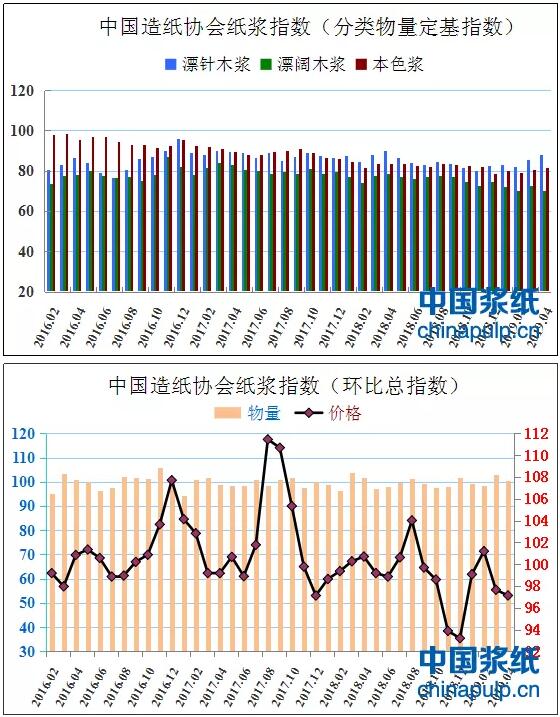 4月份,紙漿市場行情表現依舊偏弱,需求暫無明顯好轉跡象,漿市詢盤氛圍清淡,受增值稅下調,且下游市場需求不足影響,漿價延續下滑趨勢。據統計,4月份中國造紙協會紙漿價格總指數環比下滑2.90%至111.94點,下跌幅度較3月相比有所擴大,物量總指數環比上漲0.58%至79.83點,其中,漂針木漿和本色漿市場成交均量減價增,漂闊木漿量價均下滑。 具體來看,4月份漂針木漿價格指數環比下滑2.43%至112.53點,物量指數環比上漲3.18%至88.14點。本月漂針木漿市場成交量延續上月增長,漿價繼續維持下跌趨勢,整體跌幅在100-200元/噸左右,實單側重商談,4月底,漂針木漿主流品牌銀星市場參考報盤價在5300-5350元/噸。外盤方面,4月份智利Arauco銀星提漲20美元/噸,合同面價730美元/噸;俄羅斯llim針葉漿價格上漲20美元/噸;加拿大Catalyst針葉漿獅牌提漲10美元/噸,雄獅凈價730美元/噸,金獅凈價740美元/噸。4月份,針葉漿市場交投氛圍略顯寡淡,下游市場需求延續剛需采購模式,拿貨較為謹慎,漿市成交不旺,漿價小幅下滑,業者多持觀望態度,預計短期內針葉漿市場行情或將維持弱勢下行趨勢。 4月份漂闊木漿價格指數環比下滑3.24%至113.22點,物量指數環比下滑3.12%至70.21點。本月闊葉漿市場交投氣氛未有明顯改觀,需求欠佳,場內成交平平,漿價向下承壓明顯,整體跌幅在200元/噸左右,實單成交側重一單一談,月底漂闊木漿現貨均價在5150元/噸。外盤方面,4月智利Arauco明星提漲40美元/噸,合同面價720美元/噸;俄羅斯llim闊葉漿價格上漲30美元/噸。目前來看,本月闊葉漿市場行情延續低迷走勢,由于下游生活用紙市場需求萎靡不振,購買意向偏弱,場內成交動力略顯不足,紙漿市場出貨壓力有所增加;港口庫存方面,闊葉漿港口庫存壓力偏大,現貨市場供應量較為充足,貿易商以積極消化庫存為主,成交多有讓利空間,預計短期內闊葉漿需求面難以改善,漿價或呈小幅震蕩走低趨勢。 本色漿方面,4月份本色漿價格指數環比下滑3.30%至107.90點;物量指數環比上漲1.32%至81.64點,本色漿價格繼續下降。4月本色漿市場整體購銷氛圍較為清淡,需求持續疲軟,漿價延續下跌走勢,月底主流品牌金星價格5400元/噸,烏本塊3850元/噸。外盤方面,4月智利Arauco金星報價持穩,面價在710美元/噸;俄羅斯llim本色漿烏本塊價格持平上月。本月本色漿現貨市場供需兩淡,場內成交情況一般,下游紙企剛需采購,漿價整體呈窄幅下行趨勢,預計短期內本色漿現貨市場行情缺乏向好動力,漿價或將維持弱勢小幅下跌走勢。