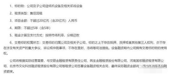 5月20日,晨鳴紙業發布公告稱,進一步拓寬公司融資渠道,盡快調整長中短期借款結構,該公司及其相關子公司擬通過交銀金融租賃有限責任公司、民生金融租賃股份有限公司、河南國宏融資租賃有限公司、北京市文化科技融資租賃股份有限公司等租賃公司開展設備融資業務,融資金額不超過人民幣20億元 (含20億元),融資期限不超過5年(含5年)。