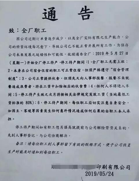 上周五,位于東莞的一家知名港資印刷廠向全體員工發出了停工待產的通知。公司聲稱因近期訂單量逐步減少,公司的經營環境每況愈下,導致公司也不能正常開展所有工作,為保存公司未來發展之延續性和可能性,故宣布從2019年5月27日星期一開始全廠停工待產。 對于員工在停工待產期間的待遇,公司作了如下規定: 一、全廠職工無須上班; 二、本身在公司宿舍住宿的員工可正常住宿,但須嚴格遵守宿舍管理制度; 三、公司正常提供伙食,但需先人事部報餐,報餐不來就餐,造成浪費者將在工資中扣除相應的伙食費; 四、任何人不得進入車間; 五,停工待產產生生效之次月,將按相關法律規定發放工資,當地最低工資標準的80%。 六,停工待產期間,每位職工應切實注意自身安全,如因主客觀等因素發生任何意外情況,造成任何后果的,由職工本人承擔。 對于公司何時恢復生產,通知里并未提及。但公司聲稱若員工想另謀高就,可以跟人事部協商。 小編從網上公開資料獲悉,這家企業是一家成立于1994年的老牌港資印刷廠,工廠擁有占地面積逾一萬二千平方米的生產基地,產品主要是出口。雖然這家企業有過頗為輝煌的過去,但是近些年來受到生產成本激增和中美貿易摩擦的影響,工廠經營狀況已到了無法維持的地步,以至于無限期停工待產。 事實上,目前珠三角外向型印刷企業普遍面臨著與該企業一樣的困境。接下來將如何面對呢?等待中美貿易爭端妥善解決?將生產設備和核心骨干人員轉移到東南亞? 然而,企業老板再怎樣的熱愛實業與不舍員工,但人工、環保、租金等成本是不可能降下來的,面對沒有贏利預期的投資環境,老板們還會堅持下去嗎?