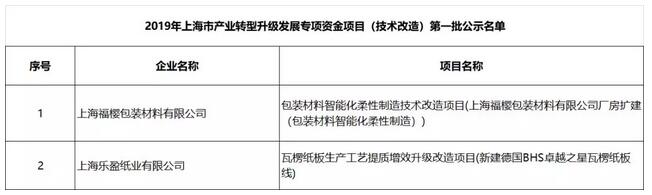 導語:5月28日,上海市經信局發布2019年上海市產業轉型升級發展專項資金項目,上海福櫻包裝材料有限公司和上海樂盈紙業有限公司的相關項目入圍。