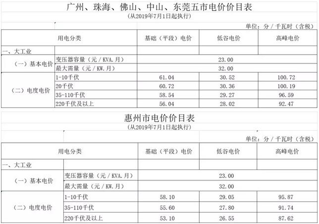 全省除深圳市外一般工商業電度電價每千瓦時統一降低5.39分(含稅,下同)。深圳市“普通工商業及其他用電”的平段電價每千瓦時降低7.18分,峰段和谷段的電價按原有比價同比例降低;深圳市“大量工商業及其他用電”、“高需求工商業及其他用電”電度電價每千瓦時統一降低0.93分。上述規定自2019年7月1日起執行。