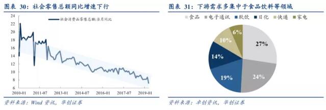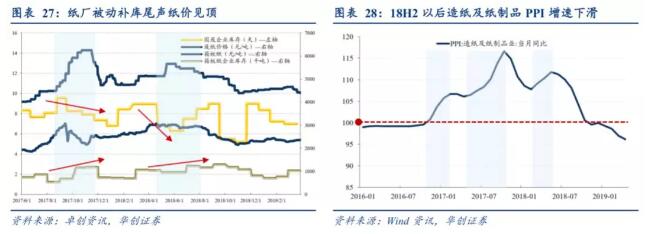 2、行業(yè)現(xiàn)狀:終端需求不振拖累上游,庫存去化開啟為提價蓄勢 下游終端需求不振,供需差呈增加趨勢。廢紙系成品紙多用于通信IT及電子、家電、辦公設(shè)備、日用化工、食品飲料、醫(yī)藥等行業(yè)。其中,以食品飲料、日化用品的包裝需求為主,需求占比在60%以上,家電、電子行業(yè)的包裝需求占比約為30%,快遞類包裝需求占比10%。根據(jù)國家統(tǒng)計(jì)局?jǐn)?shù)據(jù)顯示,2019年4月社會零售總額30586億元,當(dāng)月同比增速為7.2%,如考慮4月份節(jié)假日天數(shù)同比減少兩天因素,測算得4月當(dāng)月社會消費(fèi)品零售總額同比增長8.7%,與上月基本持平,處于近年來低位,社零增速整體下行反映終端消費(fèi)需求不振,反饋至上游紙企挺價乏力。