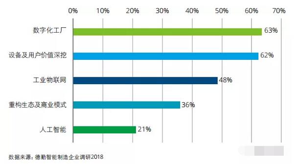▲ 全球主要市場工業機器人銷量 對中國來說,工業互聯網不是“彎道超車”而是“換道超車”,基于中國龐大的工程師數量、完善的工業基礎和大量數據潛力。 ——李義章,索為系統董事長 如何部署智能制造 德勤調查發現,中國工業企業智能制造五大部署重點依次為:數字化工廠(63%)、設備及用戶價值深挖(62%)、工業物聯網(48%)、重構商業模式(36%)以及人工智能(21%)。