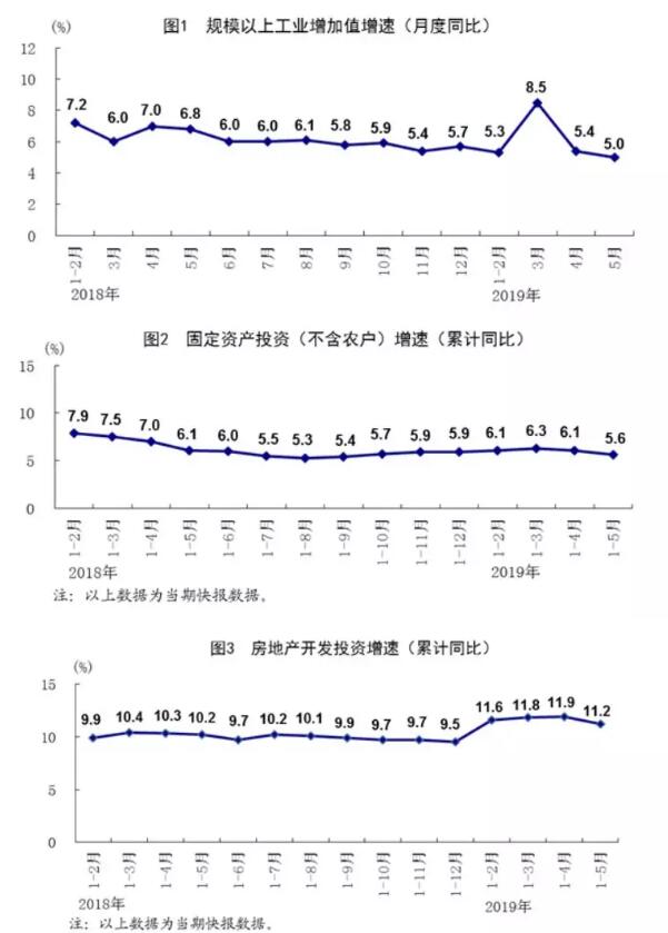 5月份國民經(jīng)濟繼續(xù)運行在合理區(qū)間 (2019年6月14日) 國家統(tǒng)計局 5月份,各地區(qū)各部門以習(xí)近平新時代中國特色社會主義思想為指導(dǎo),認真貫徹落實黨中央、國務(wù)院各項決策部署,堅持穩(wěn)中求進工作總基調(diào),統(tǒng)籌穩(wěn)增長、促改革、調(diào)結(jié)構(gòu)、惠民生、防風(fēng)險、保穩(wěn)定,堅持推動經(jīng)濟高質(zhì)量發(fā)展,扎實推進供給側(cè)結(jié)構(gòu)性改革,凝心聚力、攻堅克難,國民經(jīng)濟繼續(xù)運行在合理區(qū)間,延續(xù)總體平穩(wěn)、穩(wěn)中有進的發(fā)展態(tài)勢。 一、服務(wù)業(yè)持續(xù)增長,新興服務(wù)業(yè)深入發(fā)展 5月份,全國服務(wù)業(yè)生產(chǎn)指數(shù)同比增長7.0%,增速比上月回落0.4個百分點。1-5月份,全國服務(wù)業(yè)生產(chǎn)指數(shù)同比增長7.3%,比1-4月份回落0.1個百分點,與1-2月份持平。5月份,信息傳輸、軟件和信息技術(shù)服務(wù)業(yè),租賃和商務(wù)服務(wù)業(yè)同比分別增長22.2%和8.4%,增速分別快于全國服務(wù)業(yè)生產(chǎn)指數(shù)15.2和1.4個百分點。服務(wù)業(yè)商務(wù)活動指數(shù)53.5%,比上月上升0.2個百分點,繼續(xù)保持在榮枯線以上;鐵路運輸業(yè)、航空運輸業(yè)、郵政業(yè)、住宿業(yè)、電信廣播電視和衛(wèi)星傳輸服務(wù)、互聯(lián)網(wǎng)軟件信息技術(shù)服務(wù)等行業(yè)商務(wù)活動指數(shù)均位于60.0%以上的較高景氣區(qū)間。服務(wù)業(yè)業(yè)務(wù)活動預(yù)期指數(shù)為59.5%,處于較高水平。 二、工業(yè)生產(chǎn)穩(wěn)中有增,高技術(shù)制造業(yè)較快增長 5月份,全國規(guī)模以上工業(yè)增加值同比增長5.0%,增速比上月回落0.4個百分點。1-5月份,全國規(guī)模以上工業(yè)增加值同比增長6.0%,增速比1-4月份回落0.2個百分點。分經(jīng)濟類型看,5月份,國有控股企業(yè)增加值同比增長3.7%,股份制企業(yè)增長6.6%,外商及港澳臺商投資企業(yè)下降0.3%。分三大門類看,采礦業(yè)增加值同比增長3.9%,制造業(yè)增長5.0%,電力、熱力、燃氣及水生產(chǎn)和供應(yīng)業(yè)增長5.9%。高技術(shù)制造業(yè)增加值同比增長9.4%,比規(guī)模以上工業(yè)快4.4個百分點;新能源汽車、太陽能電池產(chǎn)量同比分別增長16.0%和9.9%。5月份,制造業(yè)采購經(jīng)理指數(shù)(PMI)分項指數(shù)中,生產(chǎn)指數(shù)和供應(yīng)商配送時間指數(shù)分別為51.7%和50.9%,均高于臨界點。 三、市場銷售增速加快,網(wǎng)上零售占比繼續(xù)提高 5月份,社會消費品零售總額32956億元,同比增長8.6%,增速比上月加快1.4個百分點。按經(jīng)營單位所在地分,城鎮(zhèn)消費品零售額28304億元,同比增長8.5%;鄉(xiāng)村消費品零售額4652億元,增長9.0%。按消費類型分,餐飲收入3631億元,增長9.4%;商品零售29324億元,增長8.5%。限額以上單位化妝品類、飲料類、日用品類、中西藥品類商品零售額同比分別增長16.7%、12.7%、11.4%和11.2%,分別快于社會消費品零售總額8.1、4.1、2.8和2.6個百分點。 1-5月份,社會消費品零售總額161332 億元,同比增長8.1%,增速比1-4月份加快0.1個百分點。全國網(wǎng)上零售額38641億元,同比增長17.8%,增速與1-4月份持平,比1-3月份加快2.5個百分點。其中,實物商品網(wǎng)上零售額30415億元,增長21.7%,占社會消費品零售總額的比重為18.9%,比1-4月份和1-3月份分別提高0.3和0.7個百分點,比上年同期提高2.3個百分點。 四、投資保持增長,高技術(shù)產(chǎn)業(yè)投資增勢良好 1-5月份,全國固定資產(chǎn)投資(不含農(nóng)戶)217555億元,同比增長5.6%,增速比1-4月份回落0.5個百分點。其中,民間投資130823億元,增長5.3%。分產(chǎn)業(yè)看,第一產(chǎn)業(yè)投資同比下降2.3%;第二產(chǎn)業(yè)投資增長3.2%,其中制造業(yè)投資增長2.7%,比1-4月份加快0.2個百分點;第三產(chǎn)業(yè)投資增長7.1%,其中基礎(chǔ)設(shè)施投資增長4.0%。高技術(shù)產(chǎn)業(yè)投資較快增長,高技術(shù)制造業(yè)和高技術(shù)服務(wù)業(yè)投資同比分別增長10.2%和15.6%,增速分別快于全部投資4.6和10.0個百分點。1-5月份,全國房地產(chǎn)開發(fā)投資46075億元,同比增長11.2%,增速比1-4月份回落0.7個百分點,比上年全年加快1.7個百分點。全國商品房銷售面積55518萬平方米,同比下降1.6%;全國商品房銷售額51773億元,同比增長6.1%。 五、就業(yè)形勢總體穩(wěn)定,調(diào)查失業(yè)率持平 1-5月份,全國城鎮(zhèn)新增就業(yè)597萬人,完成全年計劃的54%。5月份,全國城鎮(zhèn)調(diào)查失業(yè)率為5.0%,與上月持平。其中,25-59歲人口調(diào)查失業(yè)率為4.5%,比上月下降0.2個百分點,連續(xù)三個月下降。31個大城市城鎮(zhèn)調(diào)查失業(yè)率為5.0%,與上月持平。全國企業(yè)就業(yè)人員周平均工作時間為46.3小時,同比增加0.5個小時。 六、居民消費價格漲勢溫和,工業(yè)生產(chǎn)者價格漲幅回落 5月份,全國居民消費價格同比上漲2.7%,漲幅比上月擴大0.2個百分點,環(huán)比持平。分類別看,食品煙酒價格同比上漲5.8%,衣著上漲1.7%,居住上漲1.8%,生活用品及服務(wù)上漲1.0%,交通和通信下降0.9%,教育文化和娛樂上漲2.6%,醫(yī)療保健上漲2.5%,其他用品和服務(wù)上漲2.1%。扣除食品和能源價格后的核心CPI上漲1.6%,漲幅比上月回落0.1個百分點。1-5月份,全國居民消費價格同比上漲2.2%。 5月