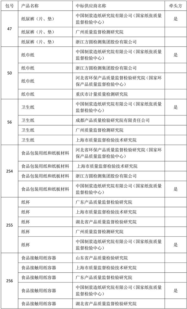 紙尿褲(片、墊)、紙巾紙、衛(wèi)生紙、食品包裝用紙和紙板材料、紙杯、食品接觸用紙容器六大類造紙相關(guān)產(chǎn)品均由中國(guó)制漿造紙研究院有限公司牽頭多家單位承擔(dān)。以上造紙產(chǎn)品相關(guān)的中標(biāo)單位及名稱詳見(jiàn)下表: