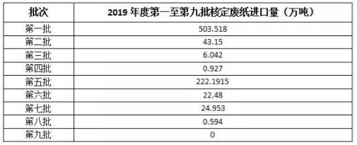 6月20日,中國固廢與化學品管理網公布《2019年第九批限制類公示表》,沒有造紙企業進入該名單,第九批核定廢紙進口量為0。