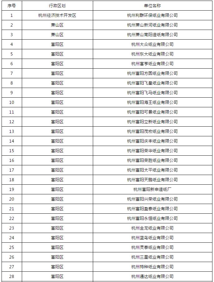 在4月底公布的杭州市重點排污單位名錄中,杭州市共確定2019年重點排污單位709家,其中造紙相關企業64家,加上此次補錄的21家,造紙企業的總數量達到85家。首批名單如下: